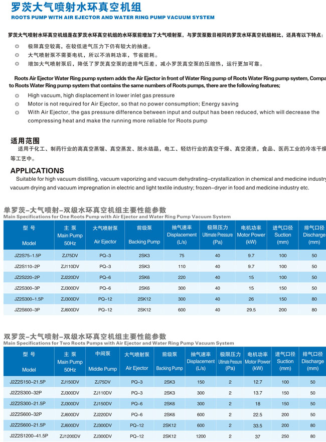 此機組主要用于需要處理大量水蒸汽,且極限真空度要求較高的抽真空系統,例如在真空干燥方面。要求處理大量水蒸汽的真空系統中,使用水環泵是較合適的,但由于其極限真空度不高,致使整個機組的極限真空度較低。雖然在要求真空度較高的抽真空系統中,需要極限真空較高的機械真空泵作為前級泵使用。但由于水環泵的耗電量大,效率很低,噪聲高,在需要長時間的真空干燥系統中,用水環泵作為羅茨泵前級泵很不經濟。